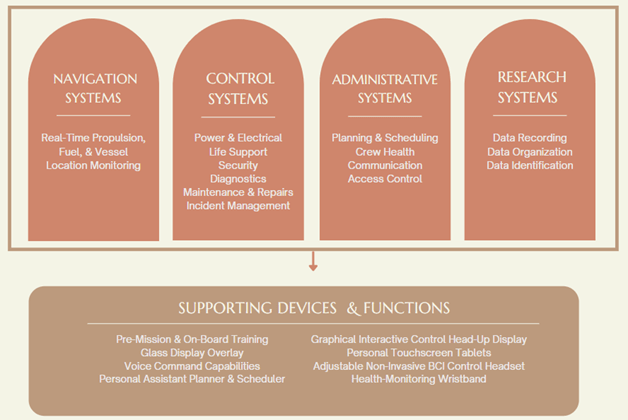 As shown, several designs and interfaces are key to this platform concept, including the main control panels, tablets, BCI, and the personal assistant and biometric health-monitoring wristband. These described user interfaces will not only assist the crewmembers in maintaining their health and making continuous determinations but also reduces the crewmember’s workload while promoting their situational awareness and skill retention. As McCann and Spirkovska (2005) note, these developments also reduce the real-estate requirements of the physical control panels and allow for both crosschecks and system redundancy.
