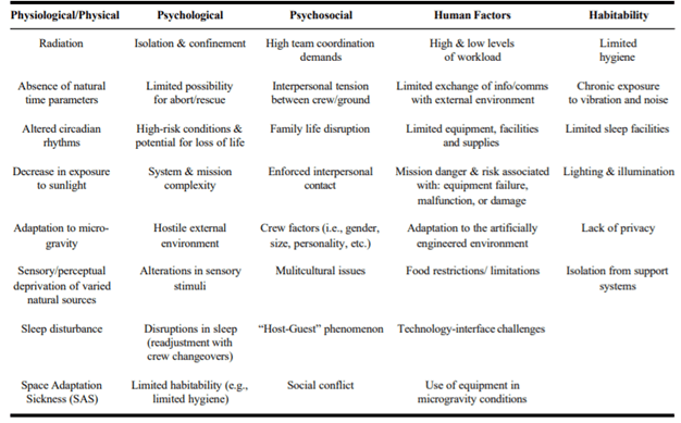 Any discussion of spacecraft operations, like McCann, McCandles, and Hilty (2005) note best, must begin with the fact that human spaceflight is one of the most hazardous and unforgiving activities ever attempted. On these missions, astronauts will experience prolonged exposure to various space-based environmental stressors, including fatigue and circadian disruptions, isolation, confinement, microgravity, and heightened radiation, which all have considerable potential to impact the crewmember’s operational capabilities and overall wellbeing. As Morphew (2001) thoroughly outlines, the spaceflight environment is extremely harsh and characterized by microgravity, solar and galactic cosmic radiation, lack of atmospheric pressure, temperature extremes, noise, vibrations, isolation, confinement, high-speed micrometeorites, and more. As shown below in Figure 3, there is a host of physiological, psychological, and environmental stressors to flight crews of long-duration spaceflight.
