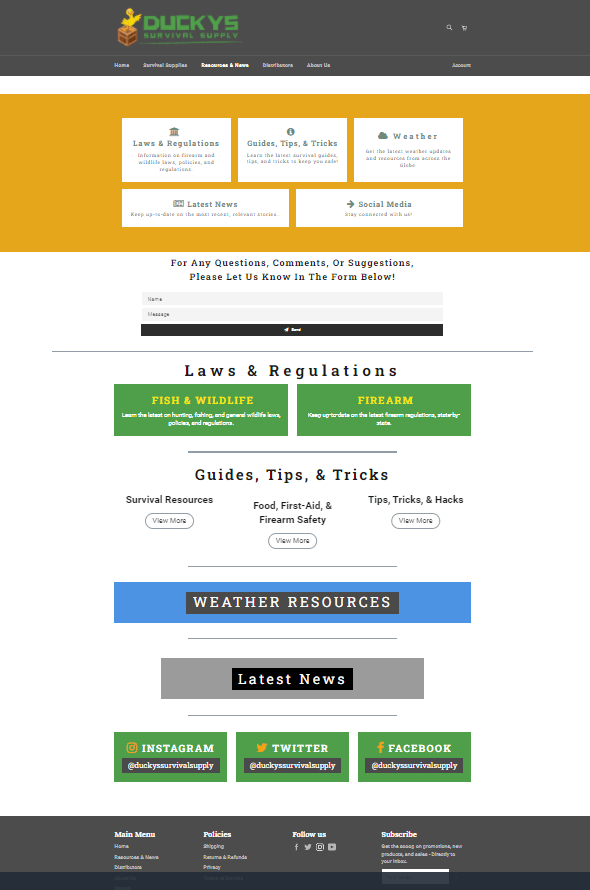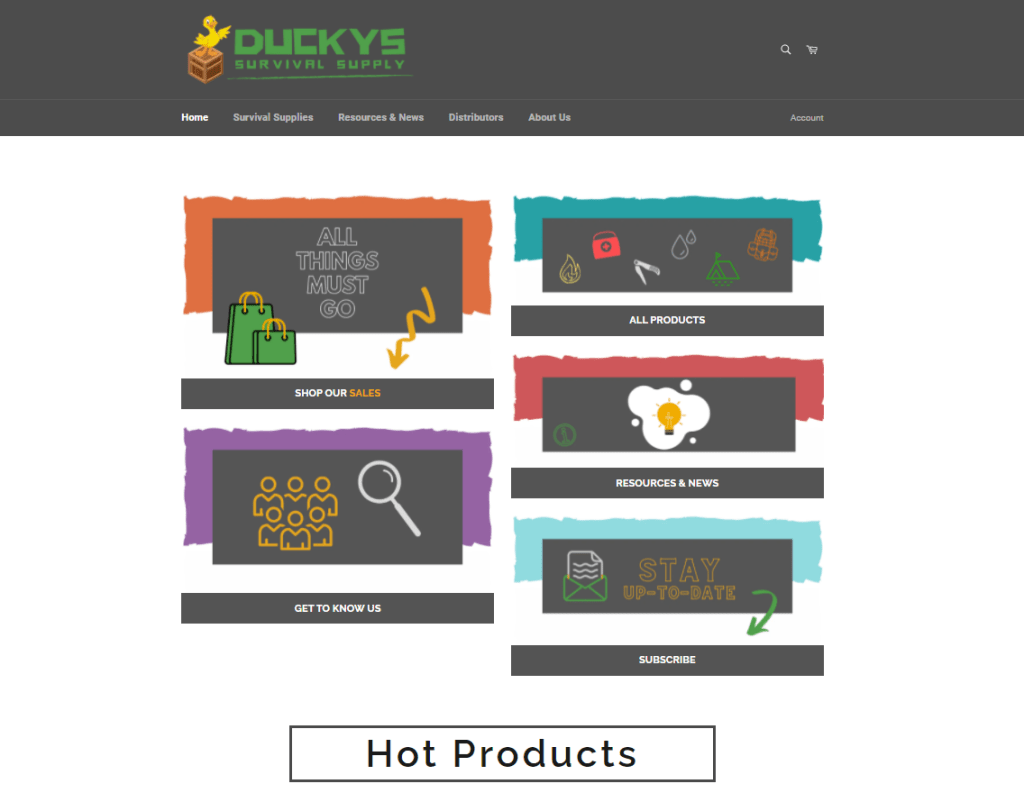 This is an example of the website design created for Ducky’s Survival Supply, LLC. It consisted of an interactive and informative landing page, a page full of relevant resources and news, as well as an established products page, distributor page, and a location for the ‘About Us’ information.